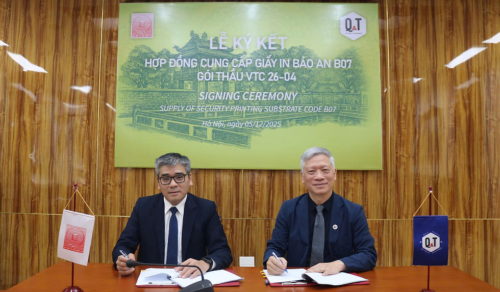 Ngày 05 tháng 12 năm 2025, tại Nhà máy In tiền Quốc gia, đã diễn ra buổi lễ hoàn thiện và ký hợp đồng Cung cấp giấy in bảo an mã hiệu B07/2026 giữa Chủ đầu tư NBPP và nhà thầu liên danh công ty Q&T và TFS.